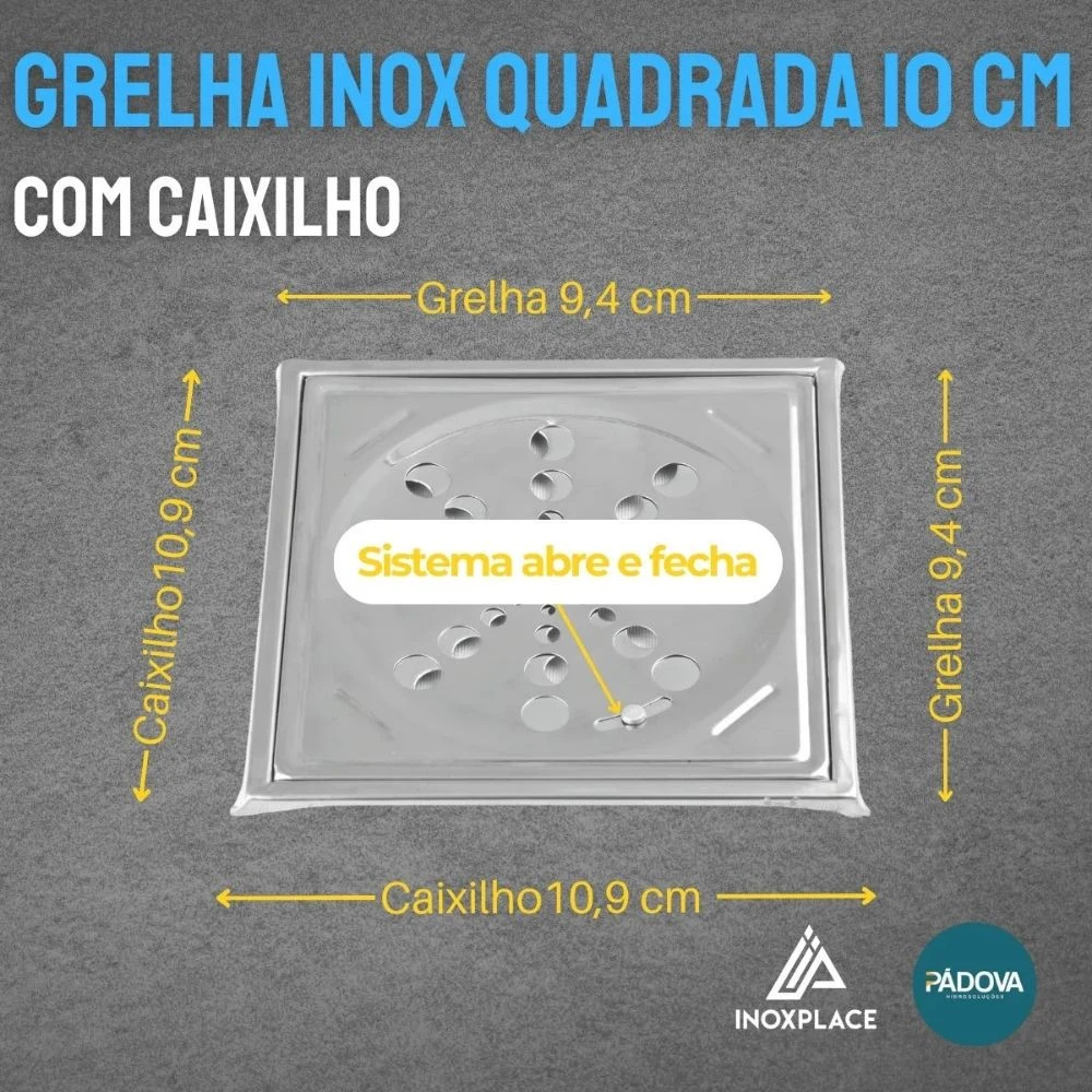 Grelha para ralo Padova em aço inox no formato quadrado 10×10 cm, com caixilho, indicada para acabamento e proteção de ralos, permitindo o escoamento eficiente da água e auxiliando na retenção de resíduos, oferecendo alta resistência à corrosão, durabilidade e acabamento discreto para ambientes internos ou externos.